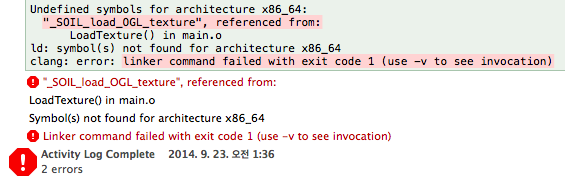SOIL에서 제공해주는 정적 라이브러리 파일(libSOIL.a)을 Link Binary With Libraries에 추가해도 잘 안 써진다. 아래 사진과 같은 에러가 뜬다.